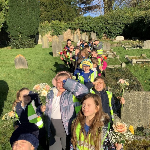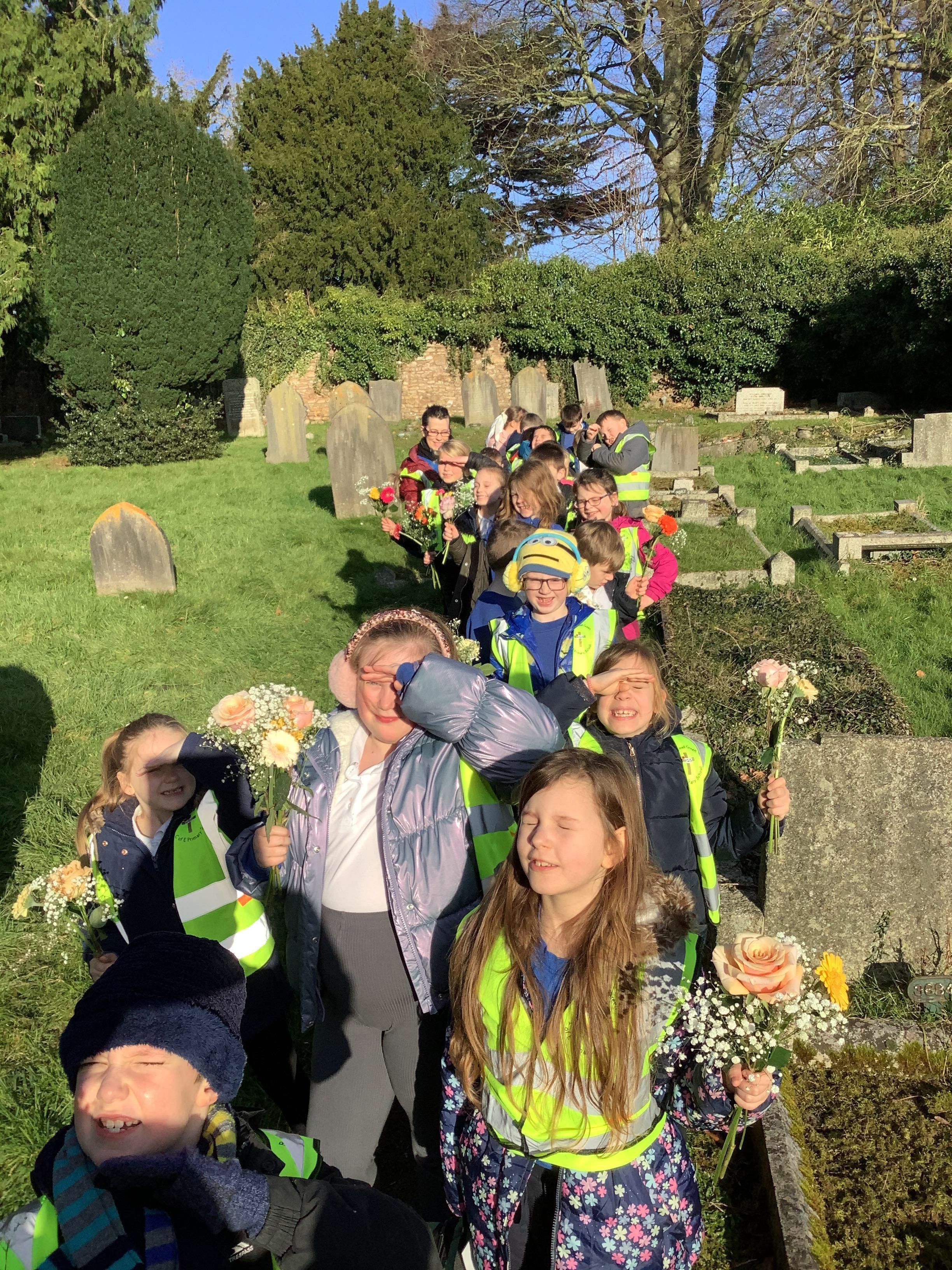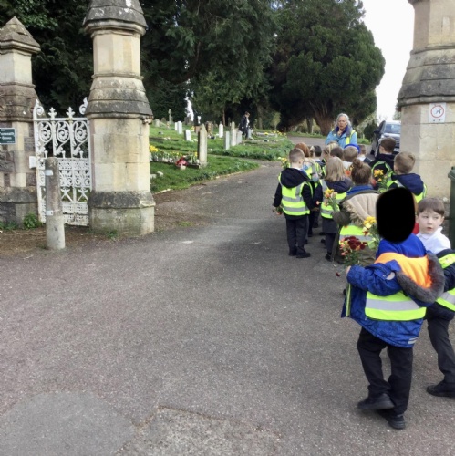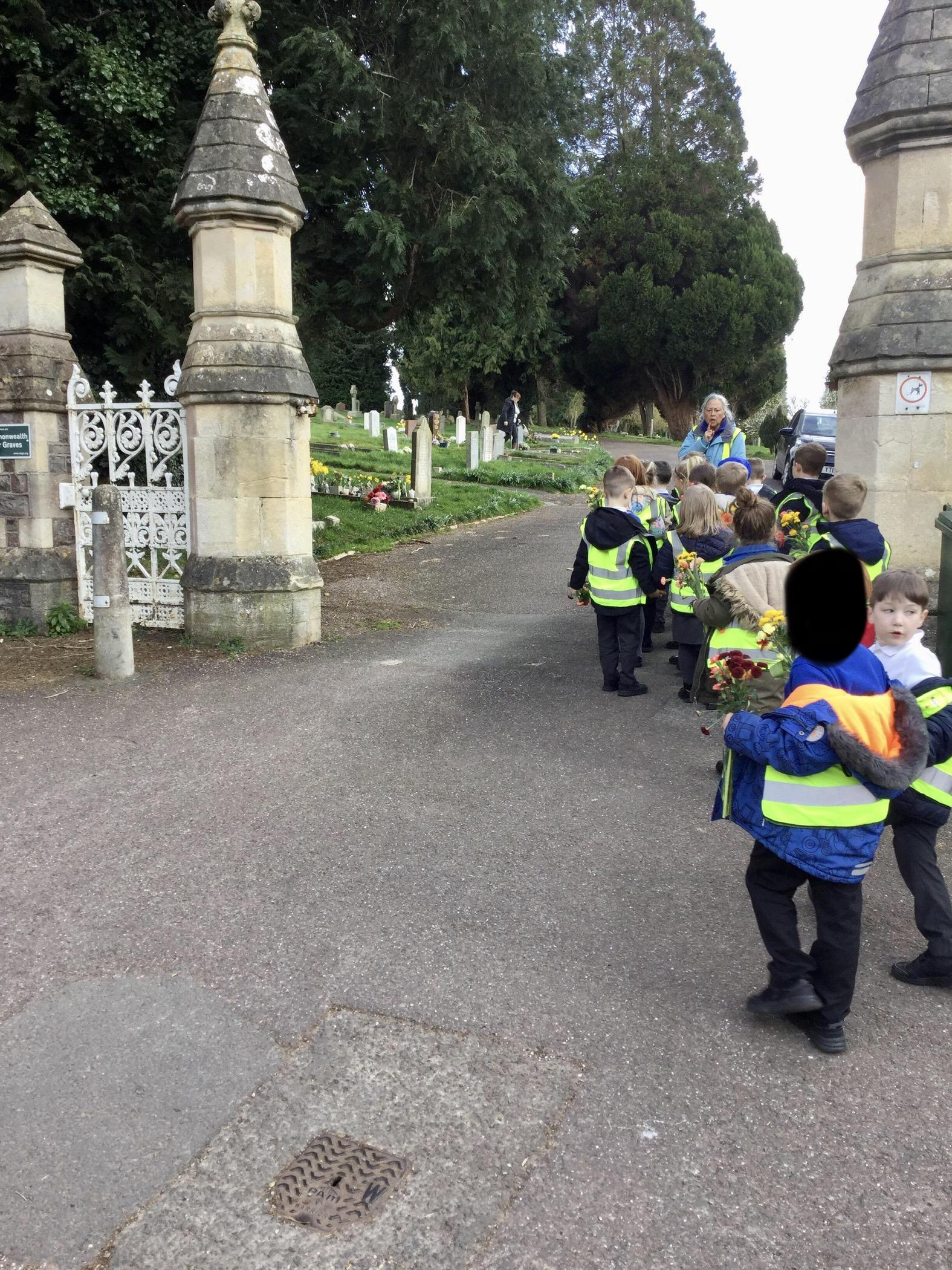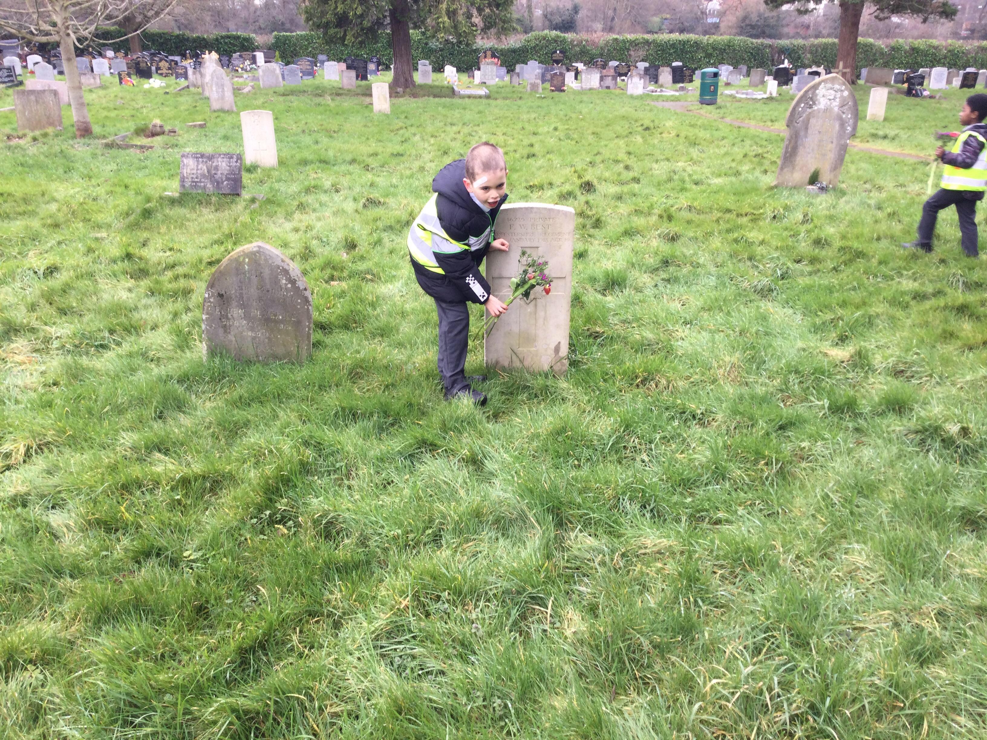 Every month a class takes flowers to the war graves at our local cemetery. Year 3, Year 2 and Year 1 went in spring term and laid the flowers to show respect to the fallen soldiers.