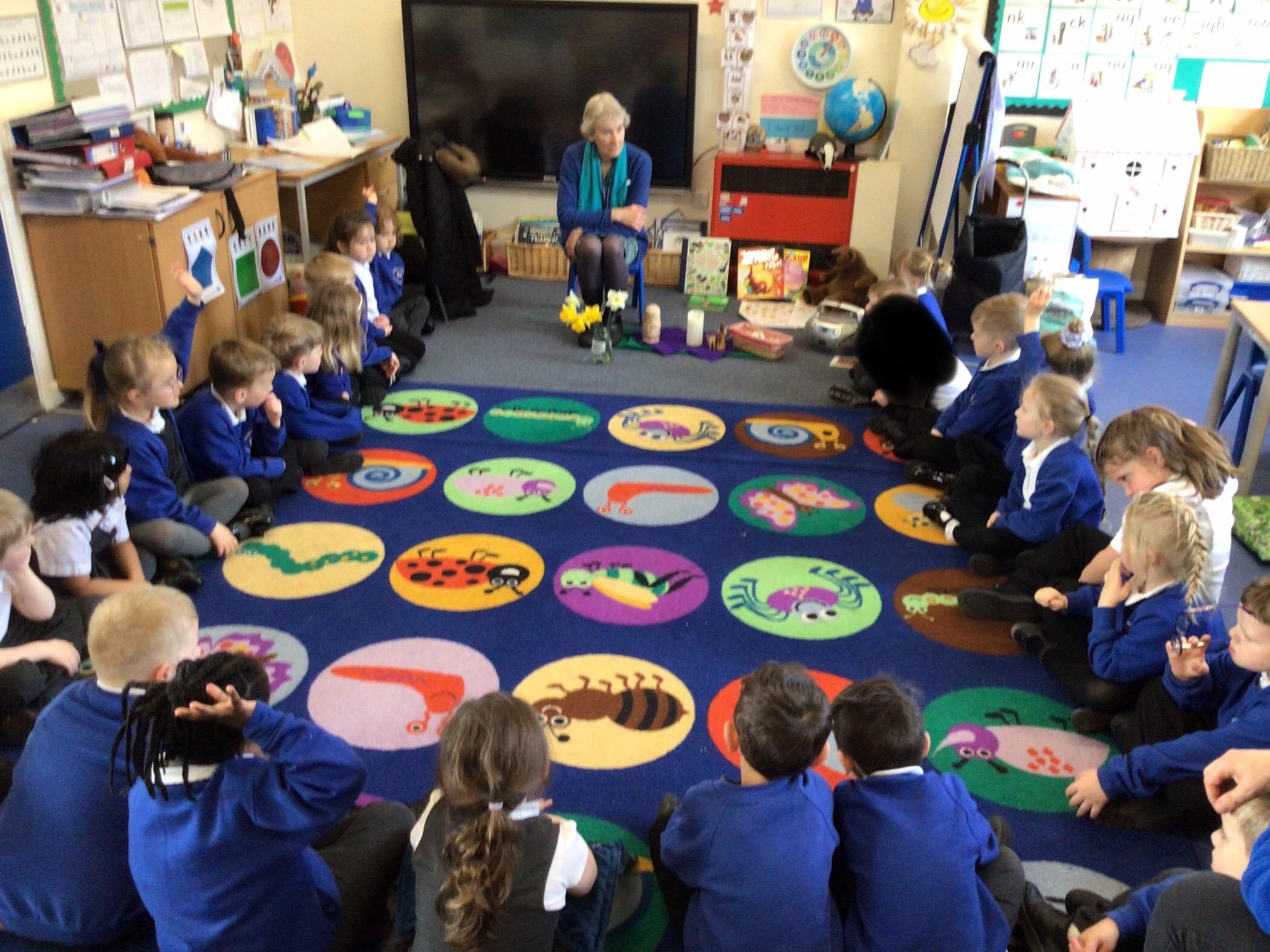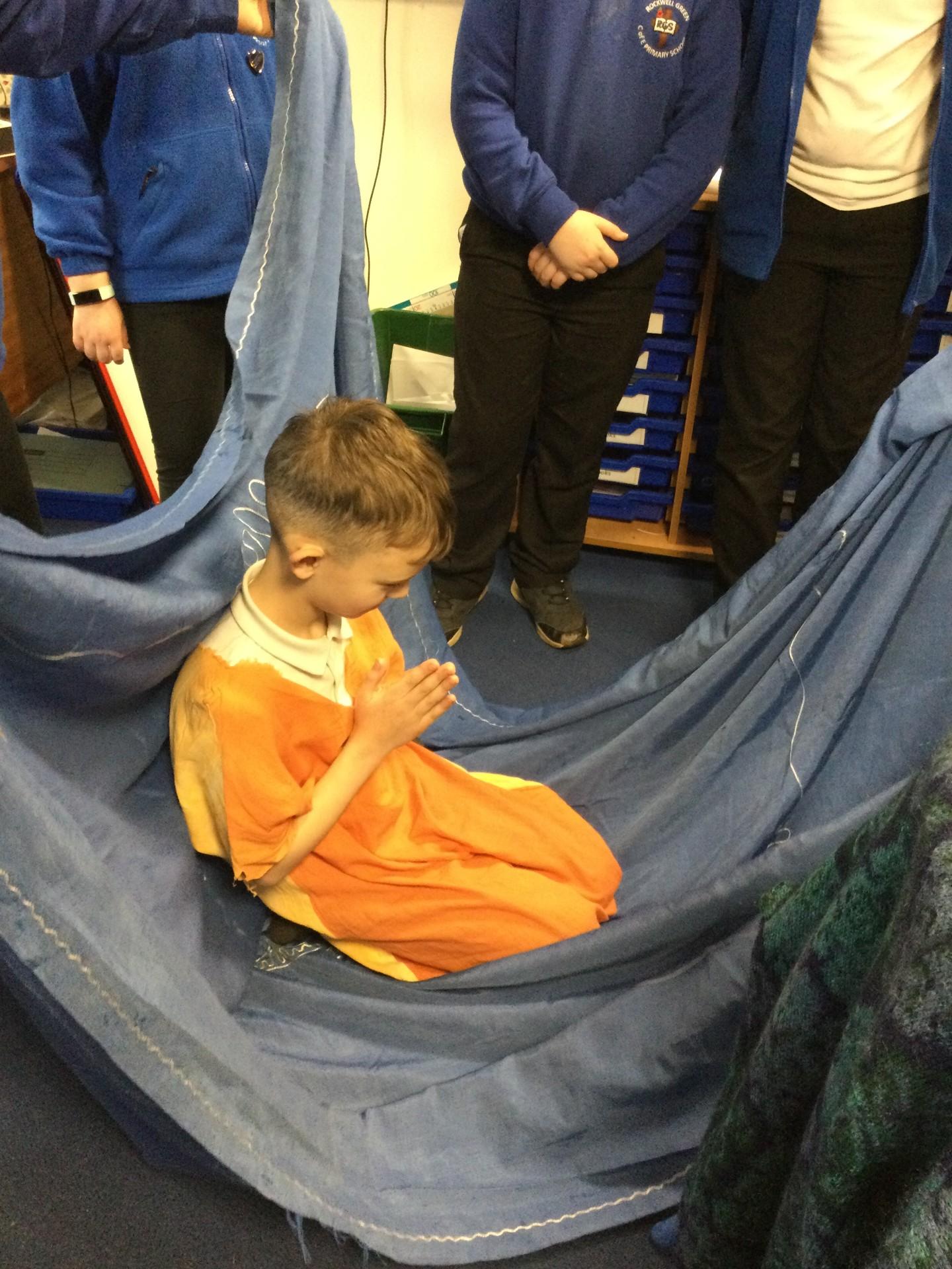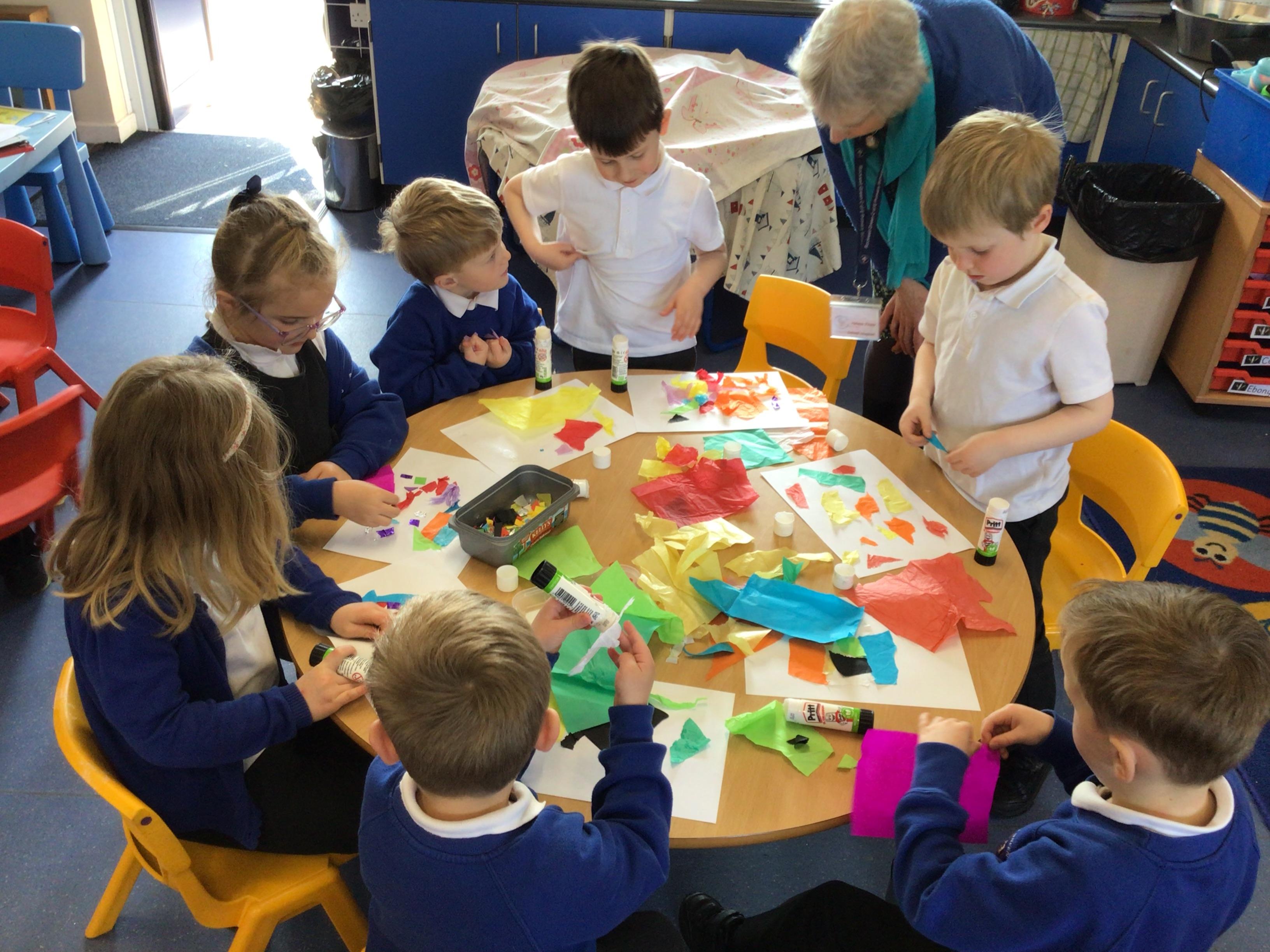 Helena our School Chaplin visited all the classes twice over the spring term. On the first visit she taught the children about Jonah and Whale using Godly Play. Then after this the children made collages to show their favourite part of the story. On the second visit she spoke with the children about spirituality'. Spirituality can take place in any form - its how you as an individual find peace and comfort. We use the look up, look out look in. Looking up is seeing spirituality within God, Look Out is finding spirituality in the natural world around us and Look in is finding peace within yourself. At the end of each session the children completed a craft linked to spirituality. Reception made a stain glass window with colours which made the children feel happy and peaceful.