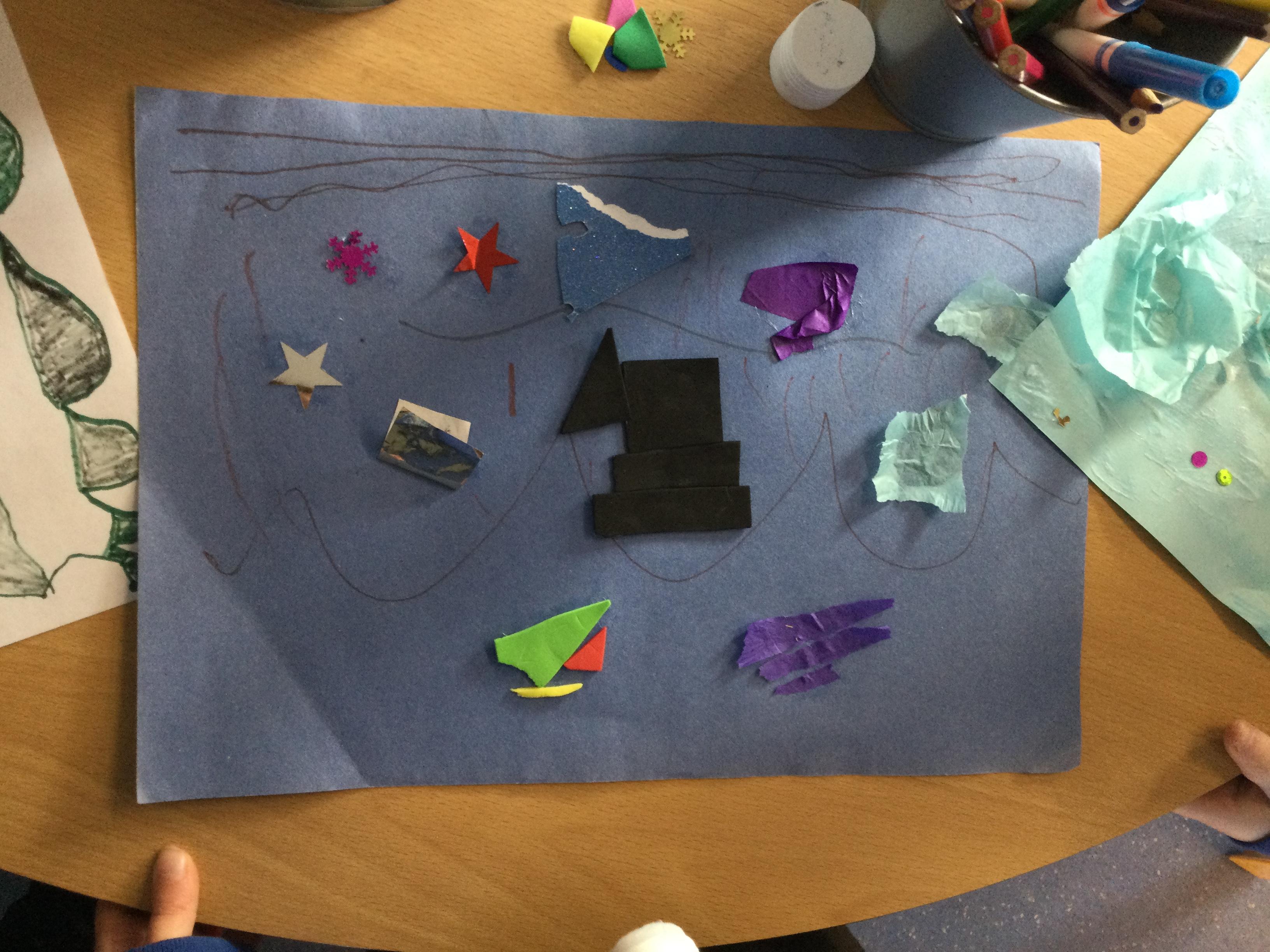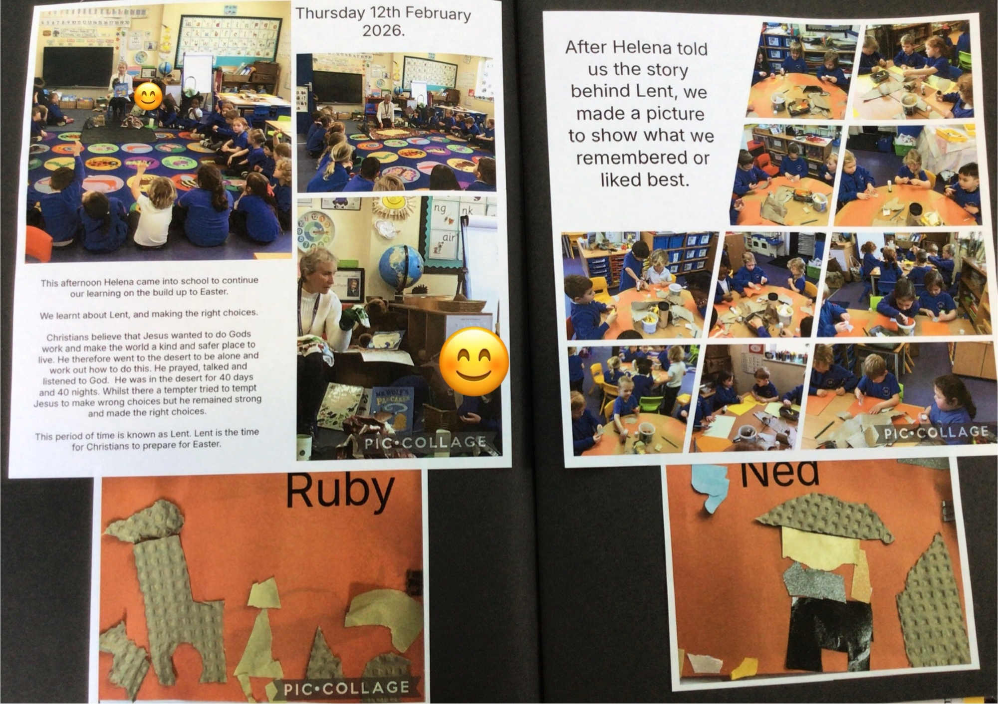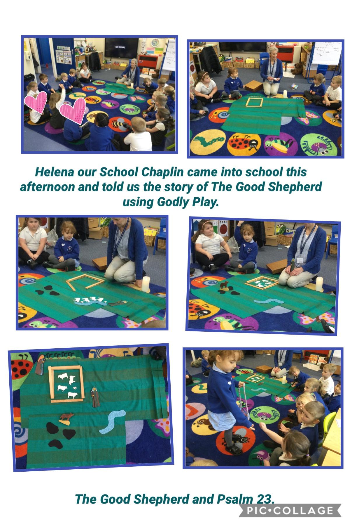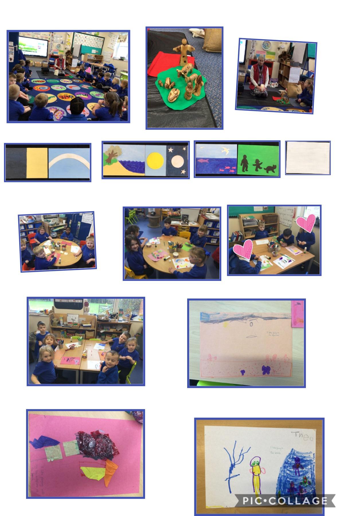 In the autumn term Helena our School Chaplin visited each class to teach them about the creation story and the parable of good Shepherd. Using Godly Play Helena told these stories and then the children recorded their thoughts from this by making collages.