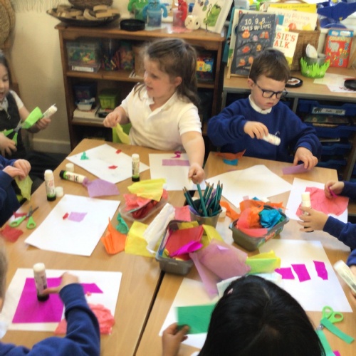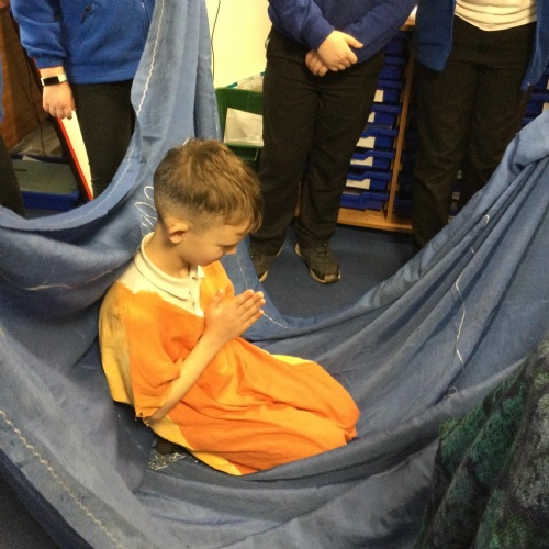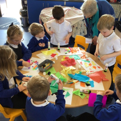 Helena our School Chaplain visited all the classes twice over the spring term. On the first visit she taught the children about Jonah and Whale using Godly Play. Then after this the children made collages to show their favourite part of the story. On the second visit she spoke with the children about spirituality'. Spirituality can take place in any form - its how you as an individual find peace and comfort. We use the look up, look out look in. Looking up is seeing spirituality within God, Look Out is finding spirituality in the natural world around us and Look in is finding peace within yourself. At the end of each session the children completed a craft linked to spirituality. Reception made a stain glass window with colours which made the children feel happy and peaceful.