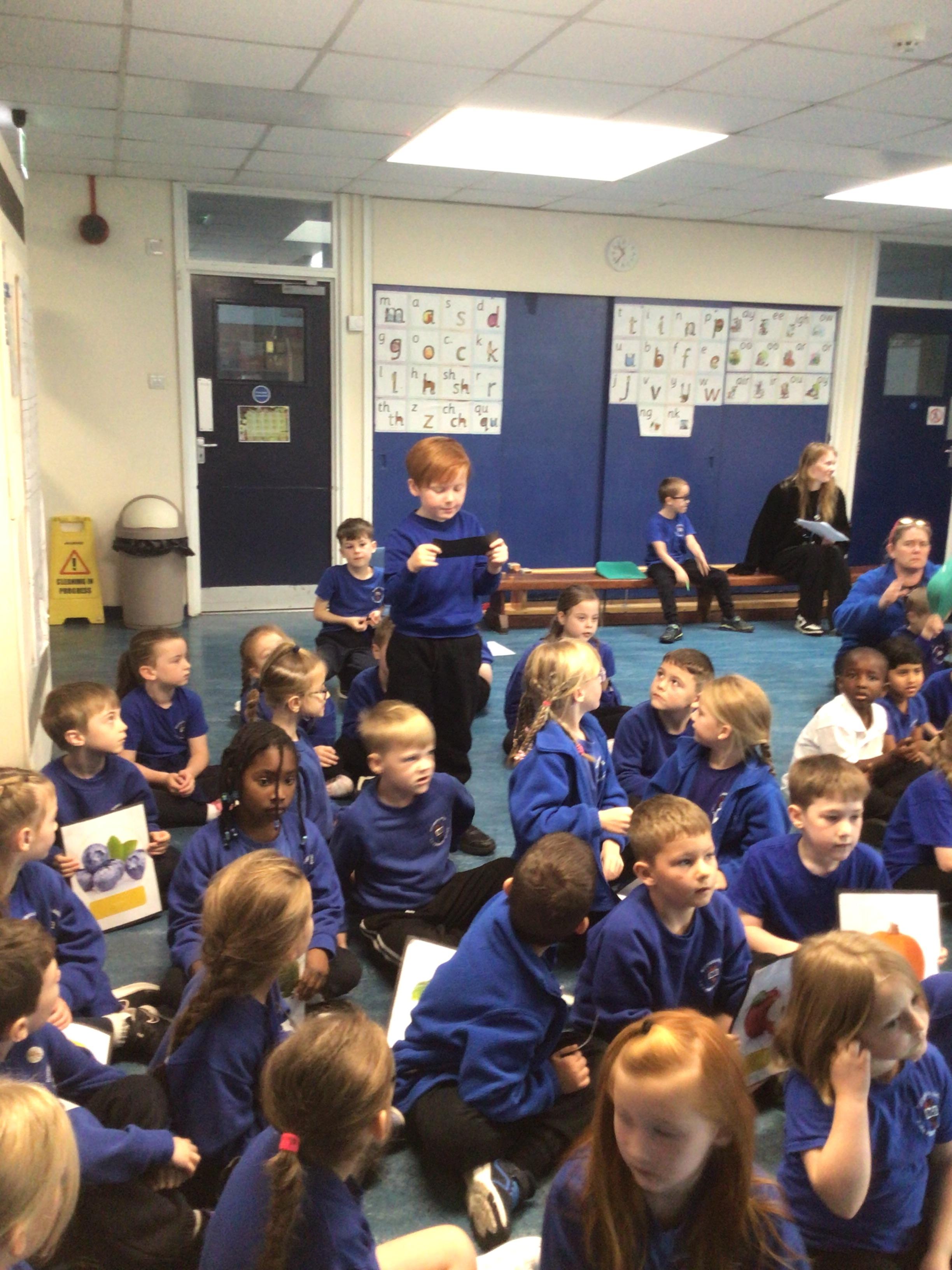 Reception sang a nursery rhyme about harvest to the tune of 'Here We Go Round A Mulberry Bush'.