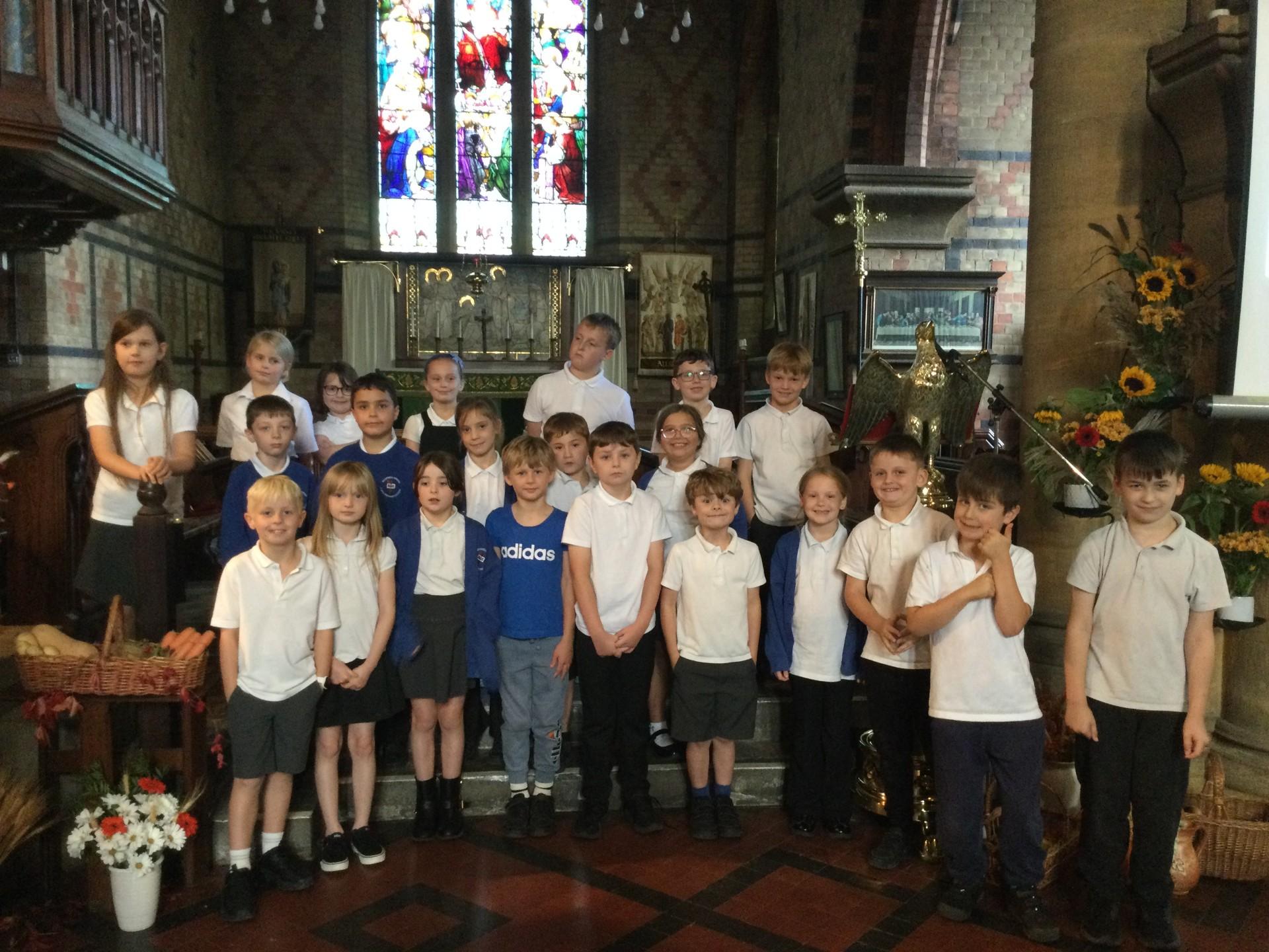 Year 6 sang 'Lord of the Harvest'. The singing leaders sang a verse together and The Values Ambassadors read a prayer.