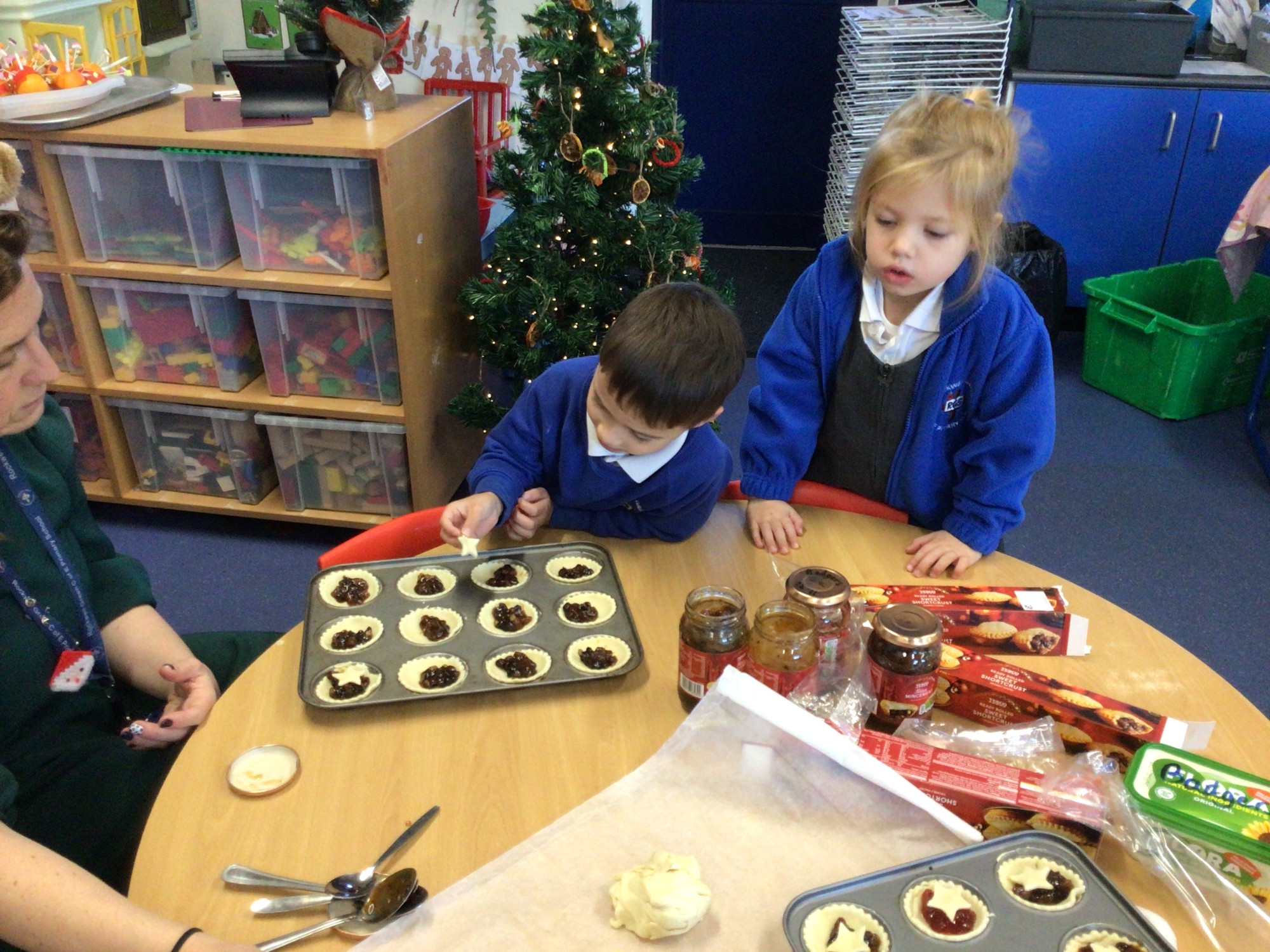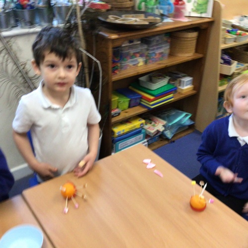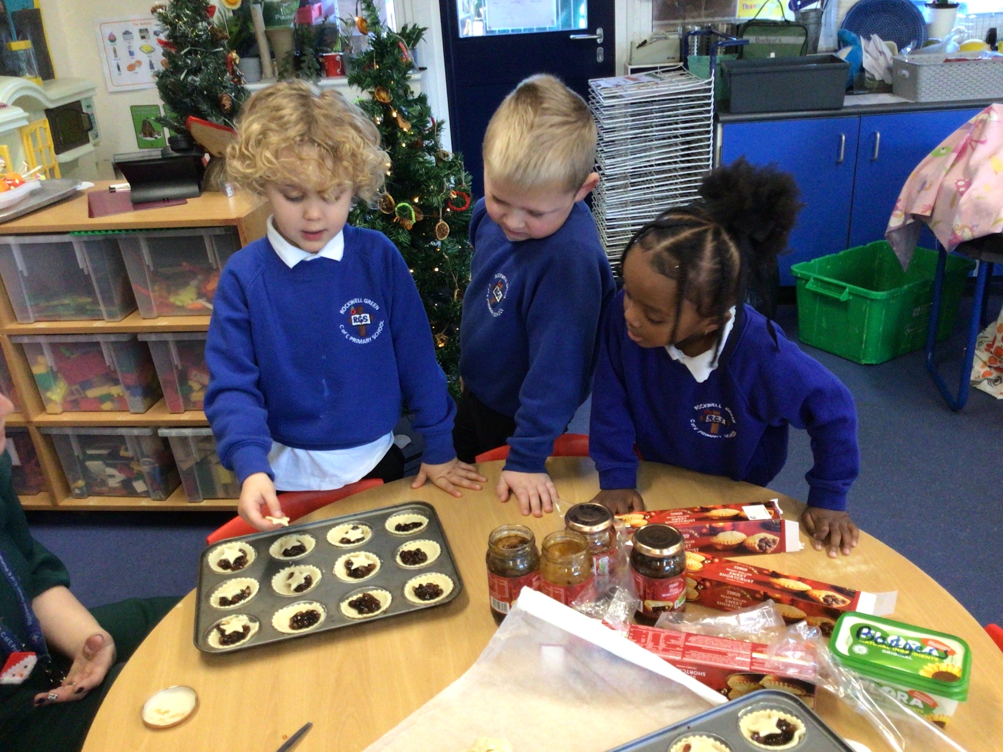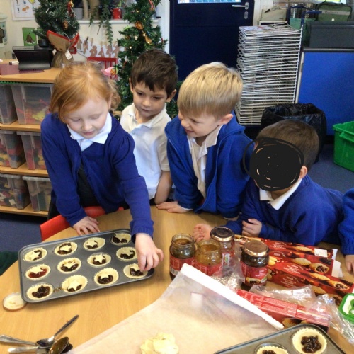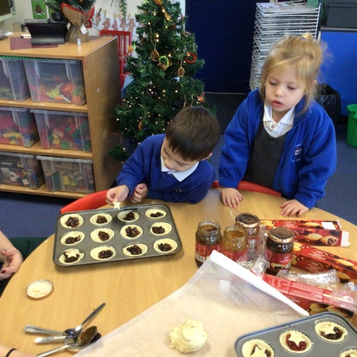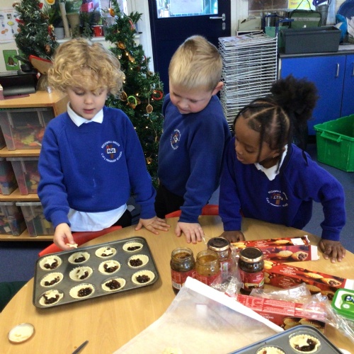 Reception class made and learnt the meaning of Christingles. Also, as part of their RE, they learnt the Christian meaning of a mince pie and why this has become a traditional Christmas food. The pastry casing and mince meat filling represent the manger and in the old days, Christians originally put a pastry Jesus on top. Now we put a pastry lid or a star.