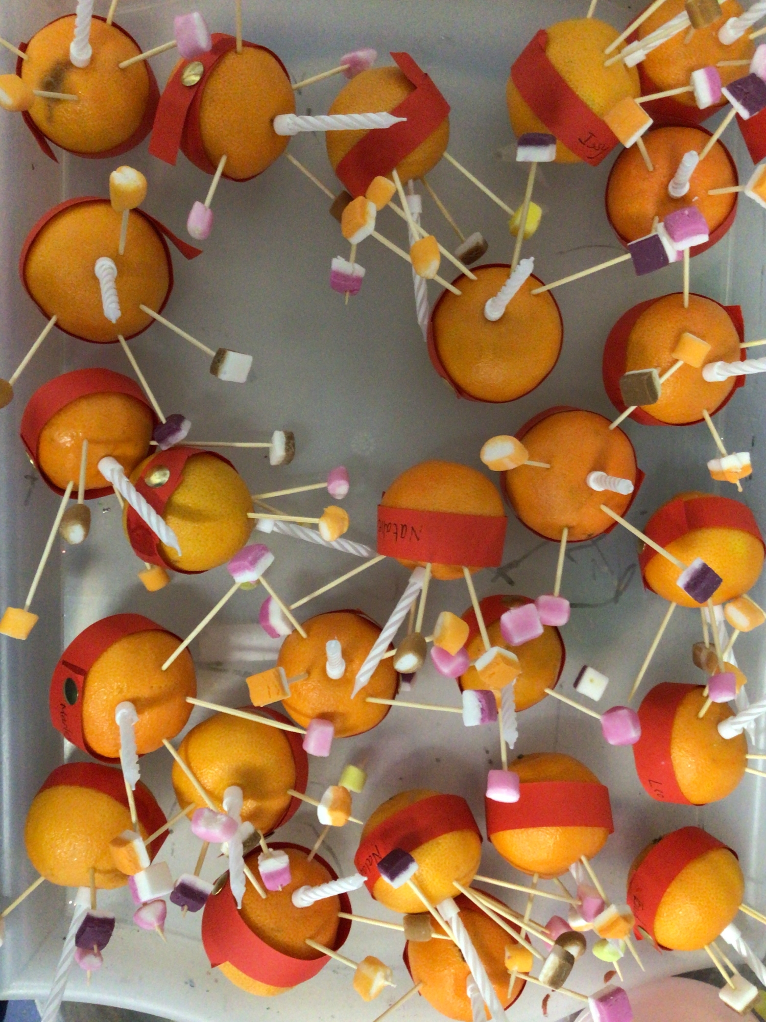 The yellow jelly baby has a necklace around it which was to illustrate the riches and treasures of the Christian life whilst the orange baby is carrying a bag which illustrated the need of being prepared for the Christian walk.